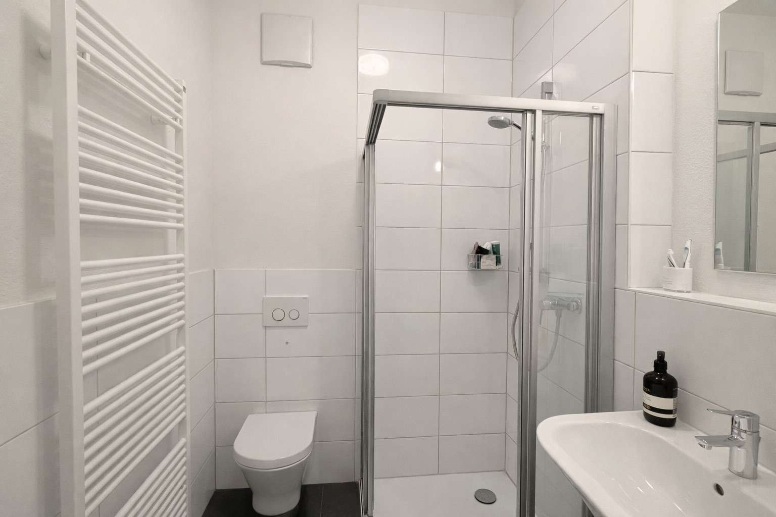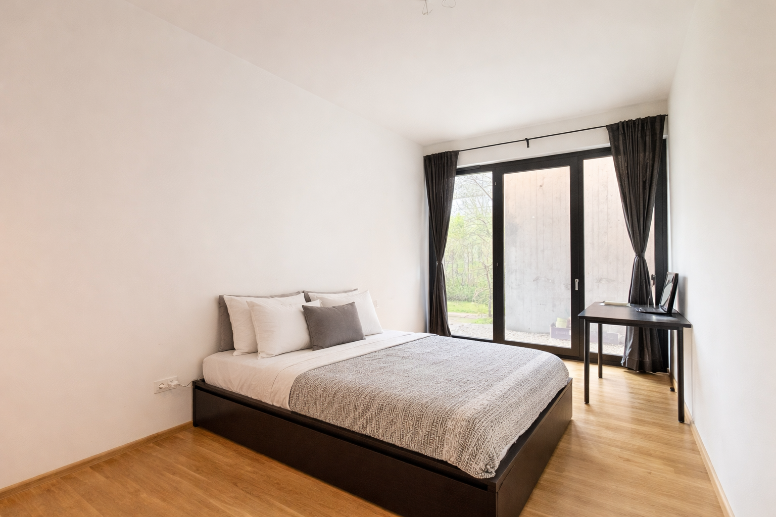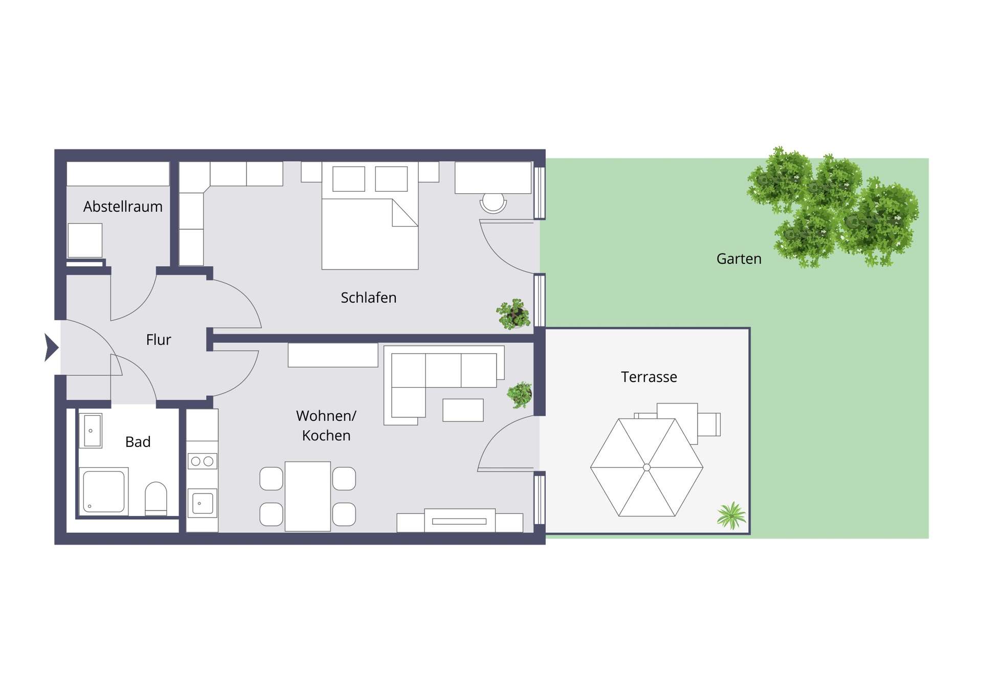 Die Wohnung verfügt über eine Wohnfläche von ca. 52 m² und überzeugt durch eine moderne und durchdachte Grundrissgestaltung. Der offen gestaltete Wohn- und Essbereich mit integrierter Küche bildet das Herzstück der Wohnung und bietet durch die großen Fensterflächen sowie den direkten Zugang in den Außenbereich eine helle und freundliche Wohnatmosphäre. Das Schlafzimmer hat eine angenehme Größe und bietet ausreichend Platz für ein Doppelbett sowie einen Kleiderschrank. Das Badezimmer ist modern ausgestattet und fügt sich stilistisch sehr gut in das Gesamtbild der Wohnung ein.