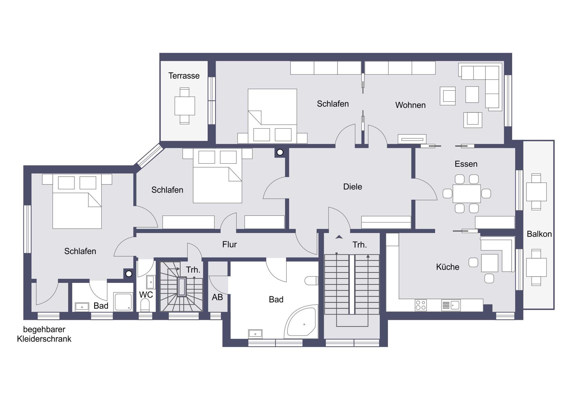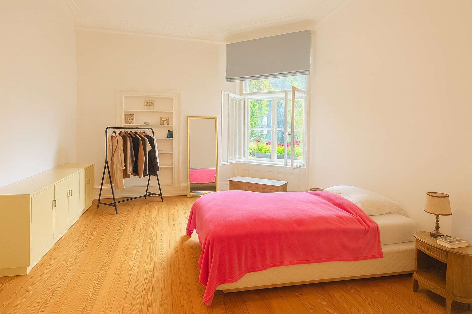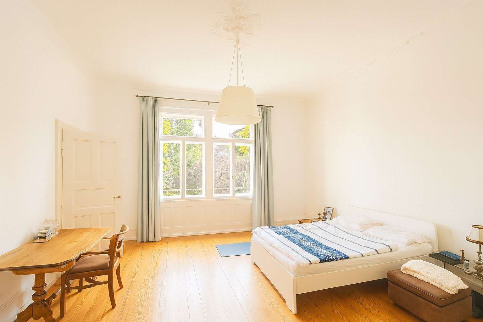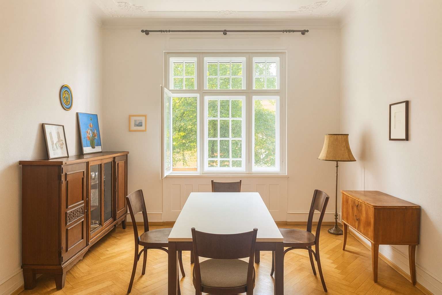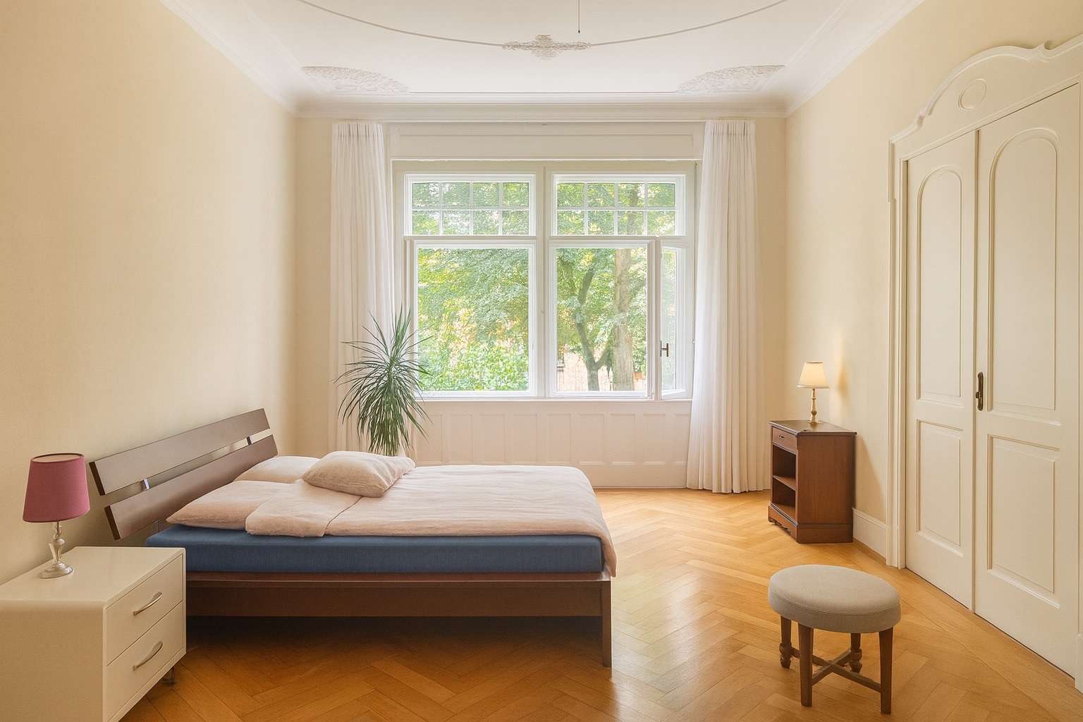 Die Wohnung verfügt über insgesamt sechs großzügig geschnittene Zimmer, die – je nach individuellem Bedarf – die Nutzung von vier bis maximal fünf Schlafzimmern ermöglichen. Zwei stilvoll gestaltete Badezimmer sowie ein separates Gäste-WC ergänzen das Raumangebot und unterstreichen den gehobenen Wohnkomfort. Zwei Balkone erweitern den Wohnraum ins Freie und eröffnen einen idyllischen Blick in das typische, von Gründerzeitarchitektur geprägte Umfeld der Wiehre.