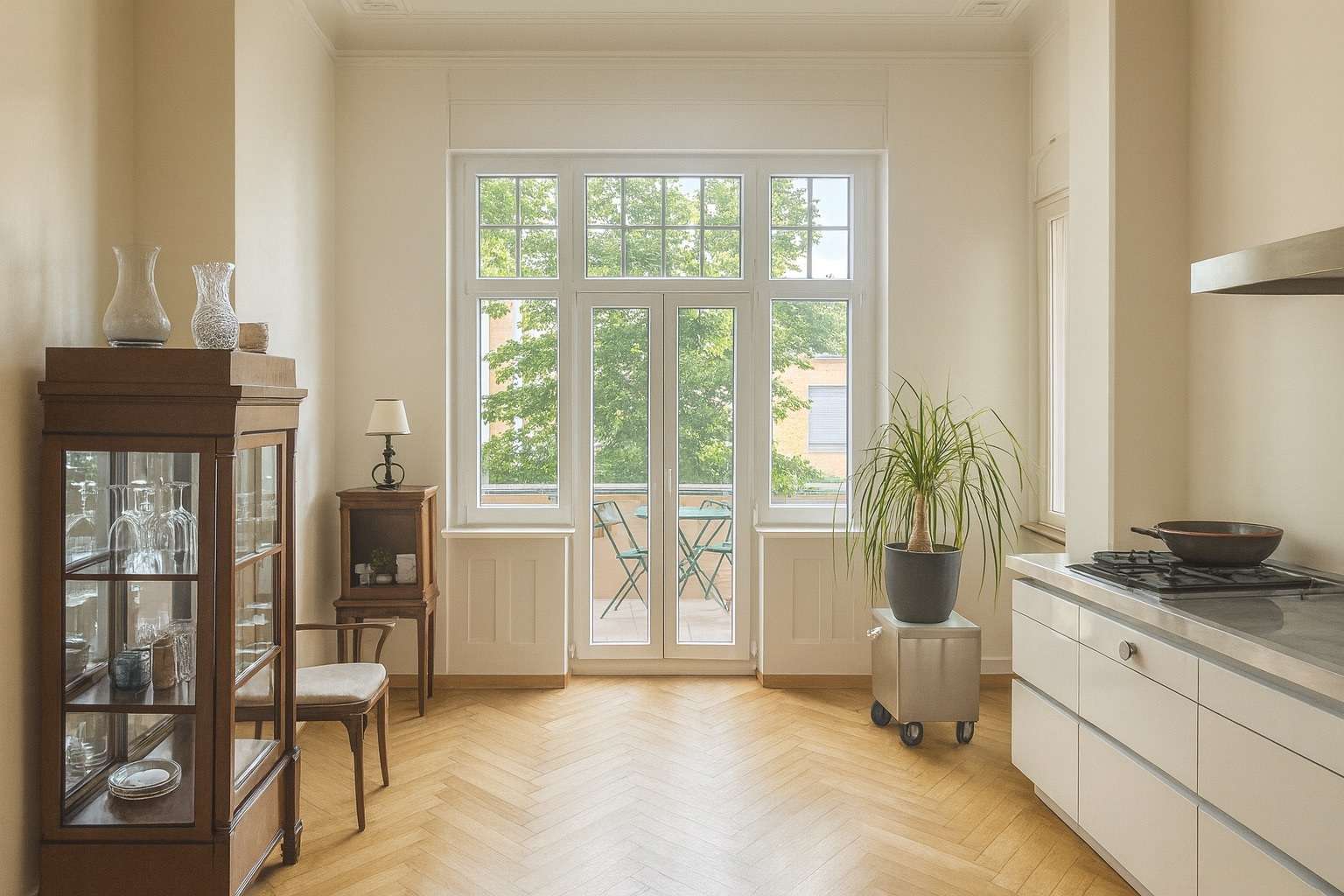 Ein besonderes Highlight stellt die hochwertige Einbauküche von bulthaup dar, ausgestattet mit exklusiven Geräten von Gaggenau – ein Genuss für Liebhaber anspruchsvoller Küchenarchitektur. Edle Parkettböden, ein durchdachtes Lichtkonzept sowie die liebevoll erhaltenen Altbaudetails verleihen der Wohnung eine außergewöhnliche und zeitlose Wohnatmosphäre.